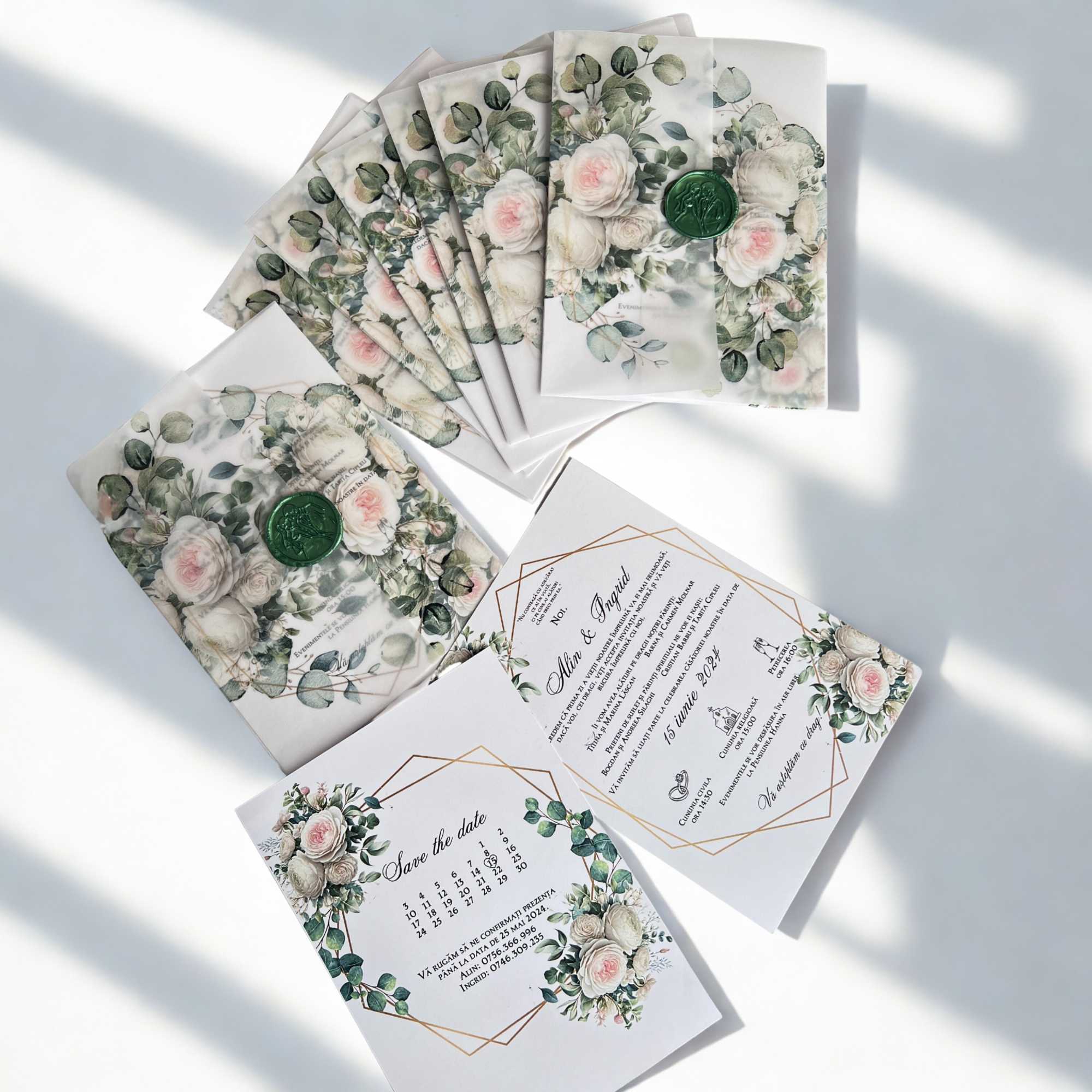 Invitație de nuntă cu copertă de calc florală și sigiliu verde – un design delicat, natural și plin de rafinament.