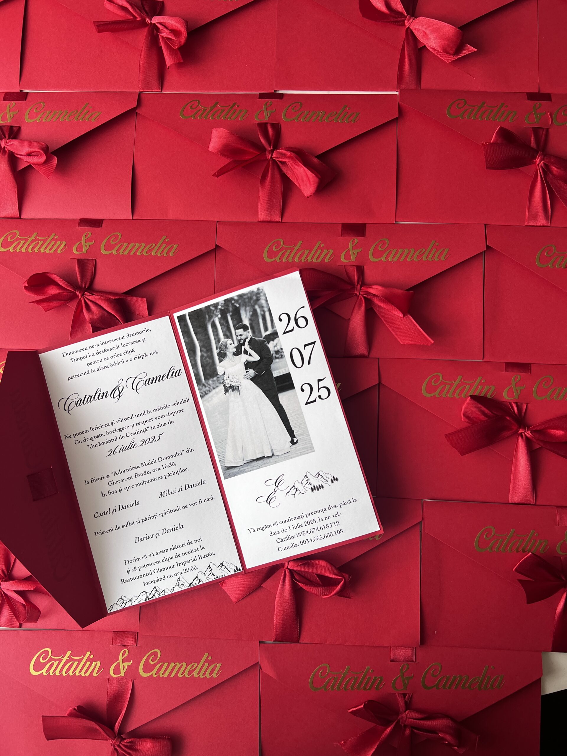 Invitație de nuntă elegantă cu poza mirilor, sticker decorativ și copertă vișinie. Personalizabilă și memorabilă – primul detaliu care face nunta voastră unică!