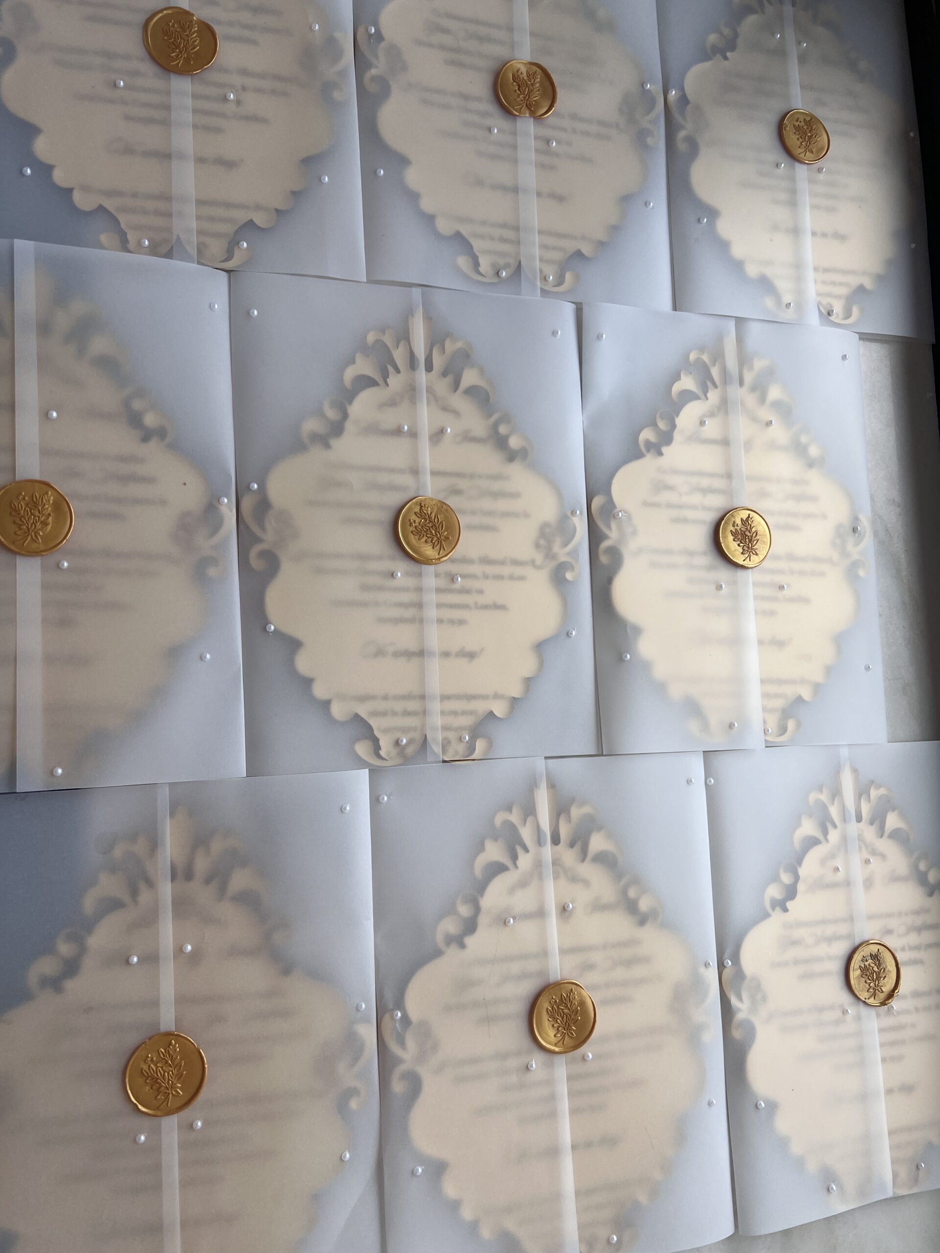 Invitație de nuntă de lux din plexiglas auriu, cu design elegant și sofisticat. Modelul estre protejat de o copertă din hârtie de calc semitransparentă, decorată delicat cu perle și închisă cu un sigiliu de ceară auriu.