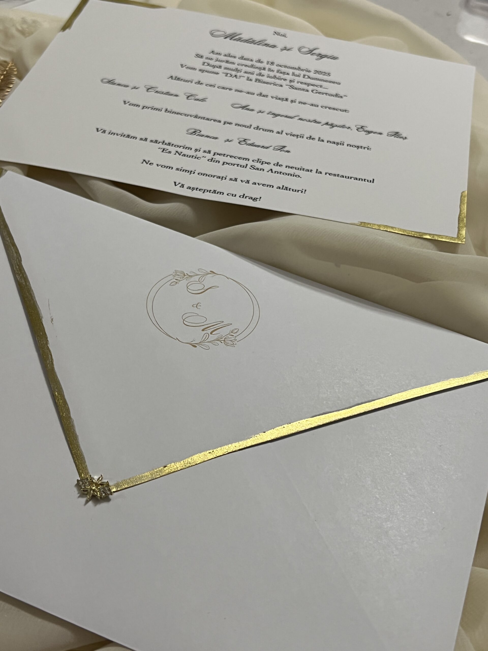 Invitație de nuntă pictată manual cu accente aurii și accesoriu cu cristale – artă și eleganță în fiecare detaliu. Această invitație de nuntă este o adevărată piesă de colecție, creată pentru cuplurile care apreciază detaliile lucrate cu grijă. Marginea aurie pictată manual oferă un finisaj artistic și sofisticat, iar plicul alb, decorat manual în tonuri aurii, completează perfect estetica. Accesoriul metalic cu cristale adaugă un strop de strălucire și unicitate, transformând invitația într-un obiect memorabil.