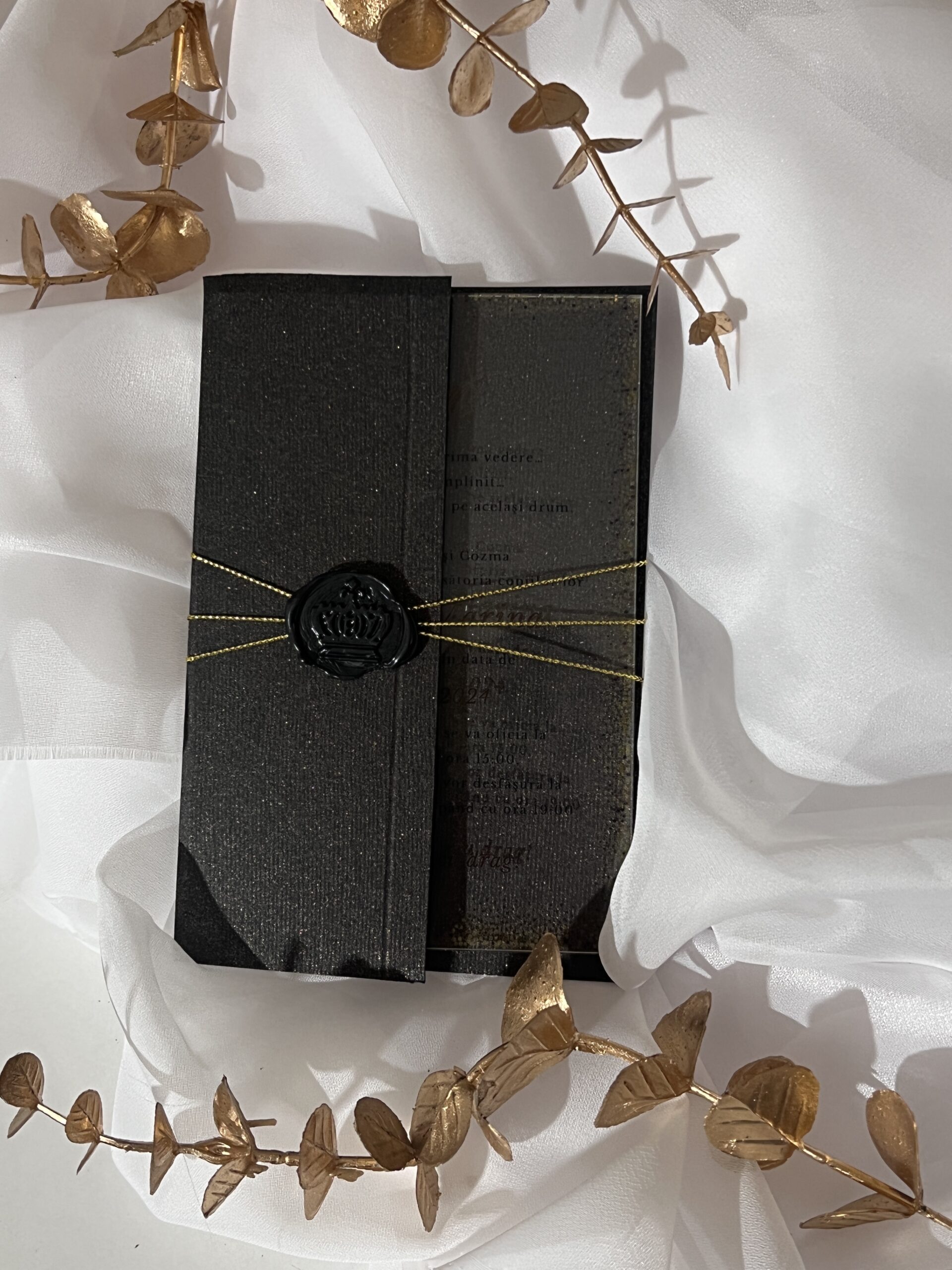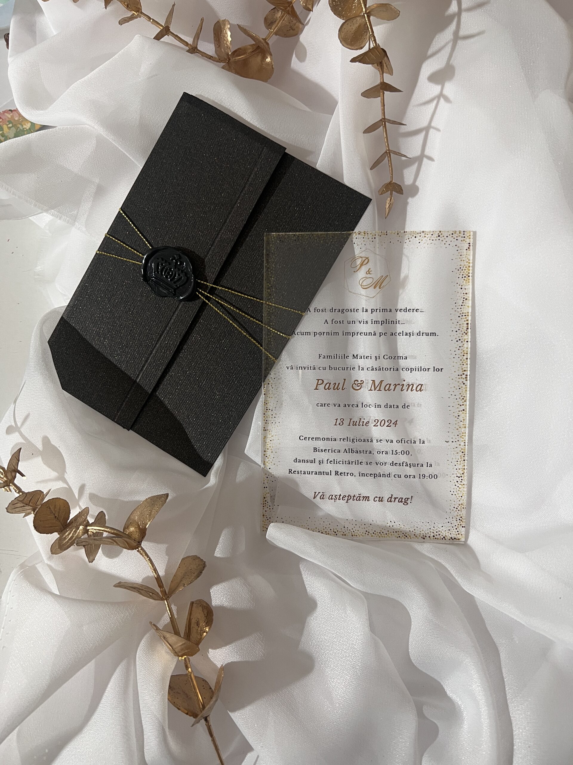 Invitație de nuntă din plexiglas transparent cu imprimare UV, copertă neagră elegantă și sigiliu din ceară – un design modern, rafinat și personalizabil, ideal pentru evenimente cu stil.