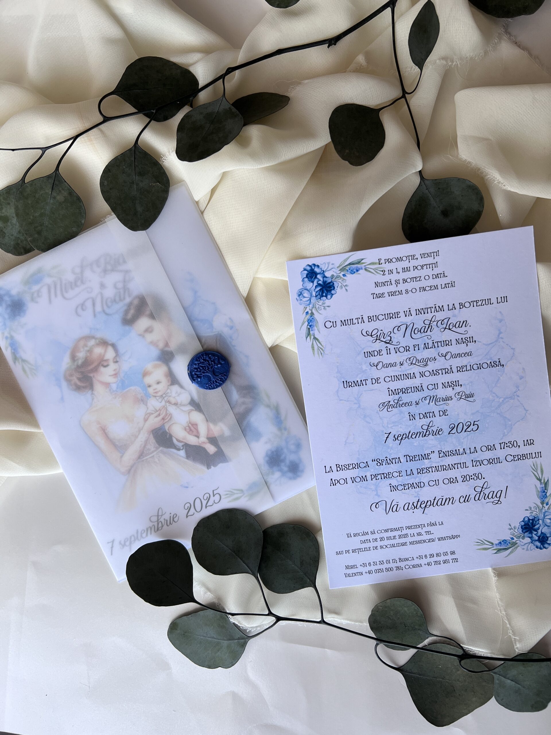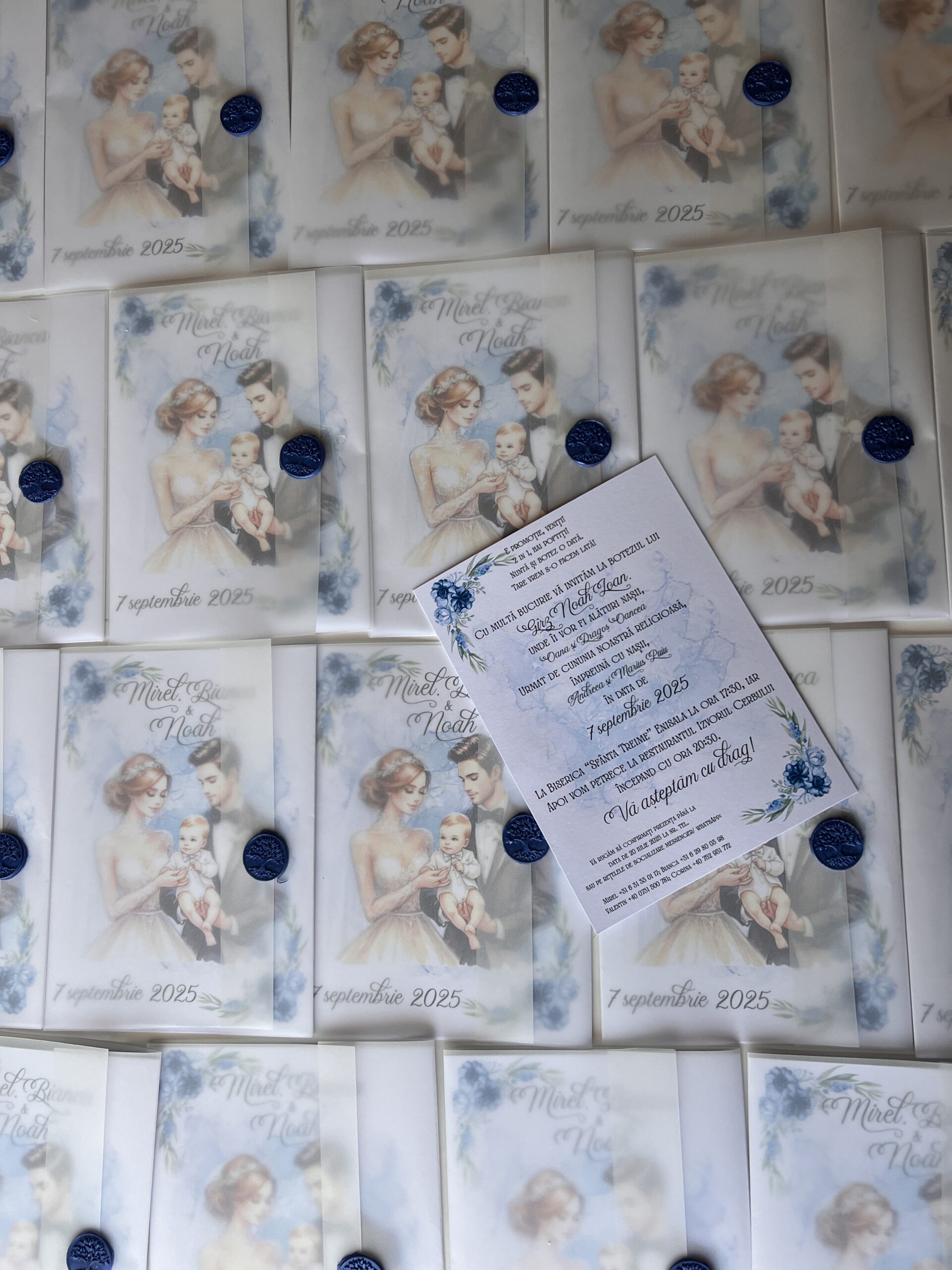Invitatie de nuntă și botez personalizată cu detalii elegante care evidențiază importanța evenimentului.